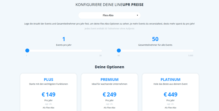 Die Flex-Preise von LineUpr (pro Veranstaltung) liegen je nach Anforderungen zwischen €179 und €539 pro Event. Je mehr Veranstaltungen du pro Jahr durchführst, desto geringer sind deine Kosten pro Event.