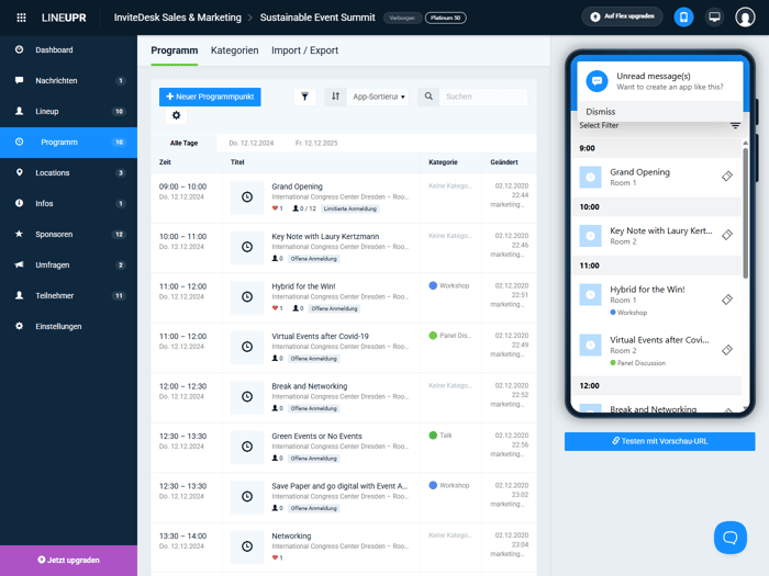 Einen schnellen Start ermöglicht und Kontrolle behält, wenn sich etwas ändert. Ein Redner sagt am Morgen der Veranstaltung ab. Ein Raum wechselt dreißig Minuten vor einer Session. Die richtige Plattform stellt sicher, dass alle Teilnehmenden sofort informiert sind.
