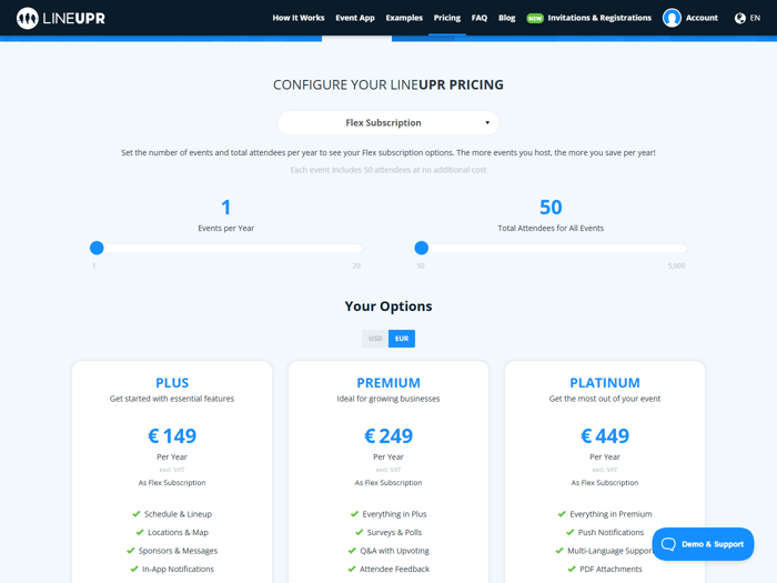 LineUpr costs between €149 and €449 per event, depending on features, with a free tier to build and preview before spending anything.